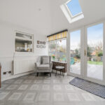 To the rear, the property has been enhanced with a bright garden room extension. With skylight window and full-height glazing incorporating French doors, this space seamlessly connects indoor and outdoor living. It is currently arranged as an additional sitting area but offers excellent flexibility as a playroom, home office or entertaining space.