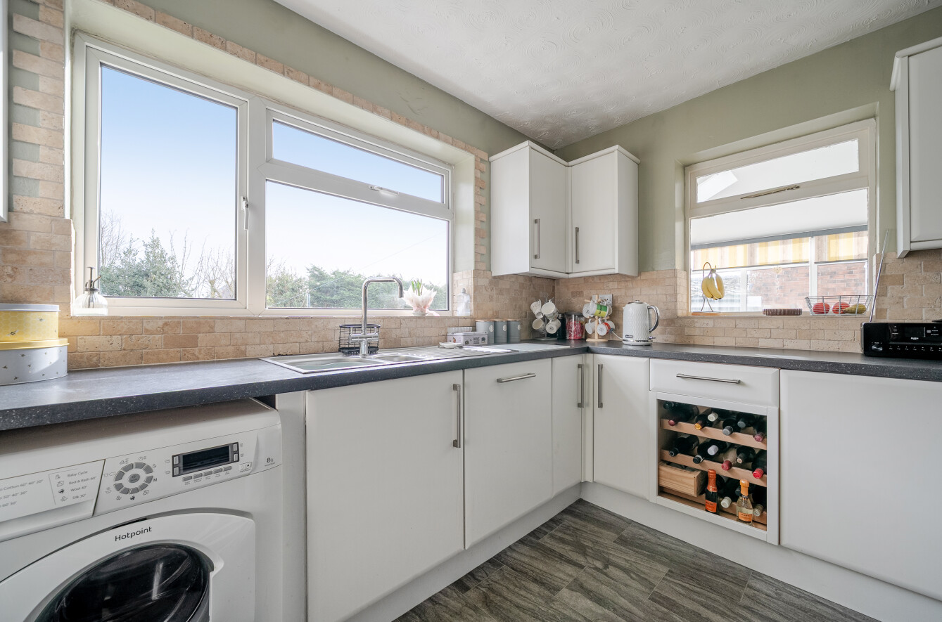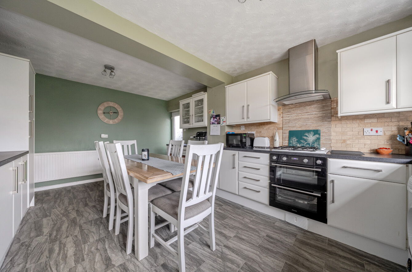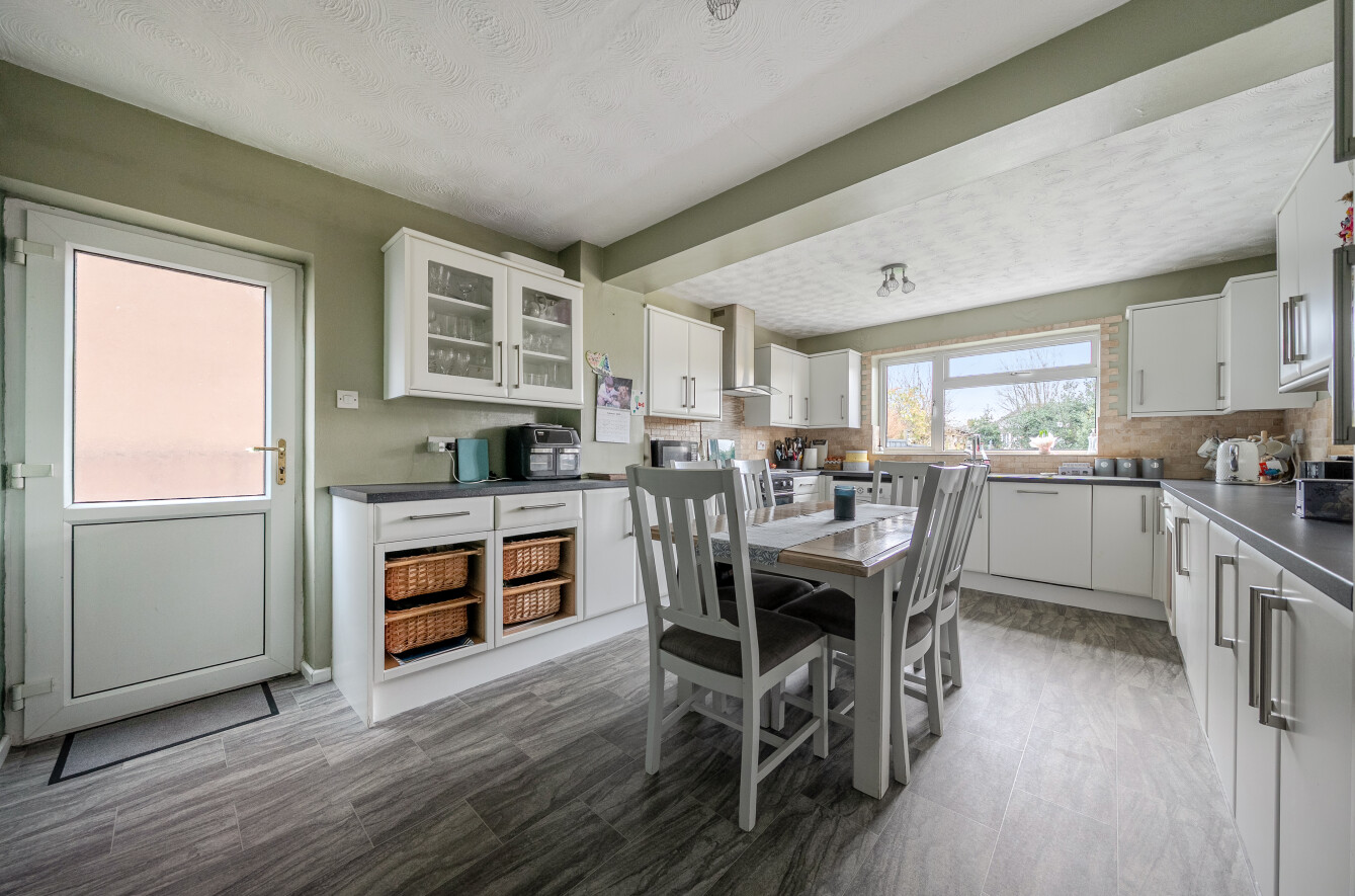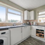The kitchen/dining room is particularly impressive, generous in scale and thoughtfully laid out. Modern white cabinetry, extensive work surfaces and integrated appliances combine practicality with style. There is ample space for a full dining table, making it an ideal family hub. A side door provides additional external access.