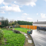 The rear garden is a genuine highlight and offers excellent depth compared to many similar homes. A raised composite decking area provides an ideal entertaining platform directly accessed from the garden room. Steps lead down to a generous lawn bordered by mature shrubs and fencing, creating a private and secure environment ideal for children and pets.