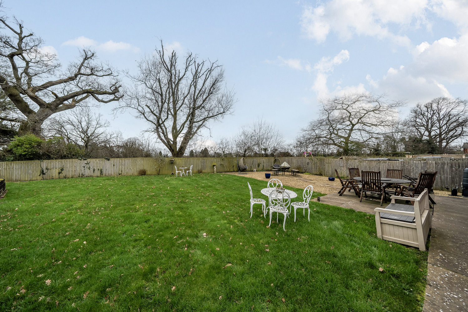 The rear garden is a standout feature — notably generous in size and predominantly laid to lawn with defined patio seating areas. It provides ample space for children to play and for outdoor entertaining, all within a fully enclosed and private setting. The garden is also south facing.