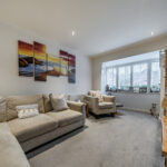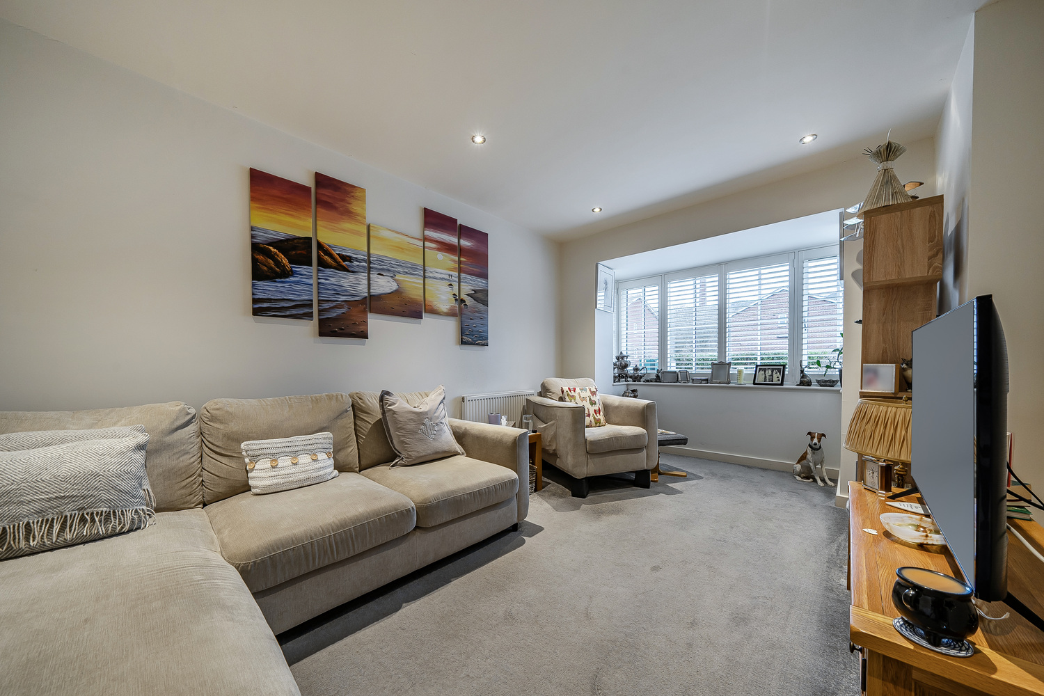 The principal living room is bright and welcoming, enhanced by a large bay window that floods the space with natural light. Well-proportioned and elegantly finished, it provides the ideal setting for both everyday family living and entertaining.