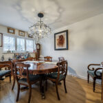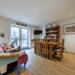 The dining area flows seamlessly from the kitchen and benefits from French doors opening directly onto the patio and garden, creating effortless indoor–outdoor living during warmer months.