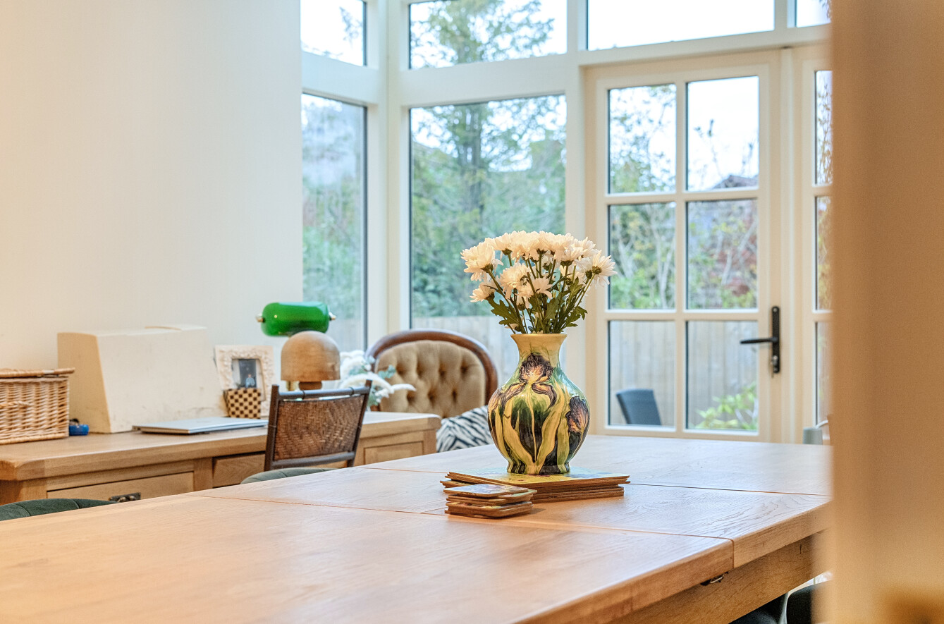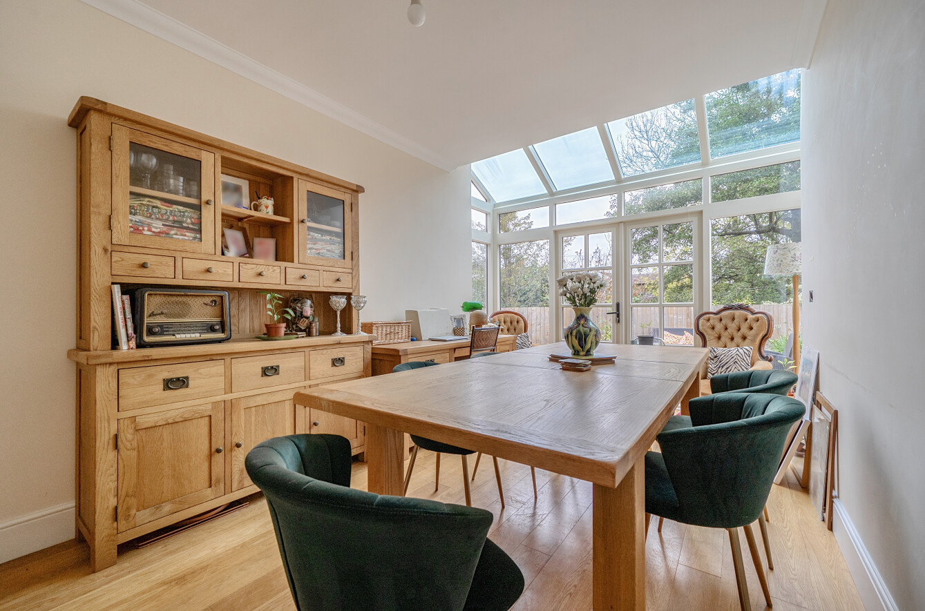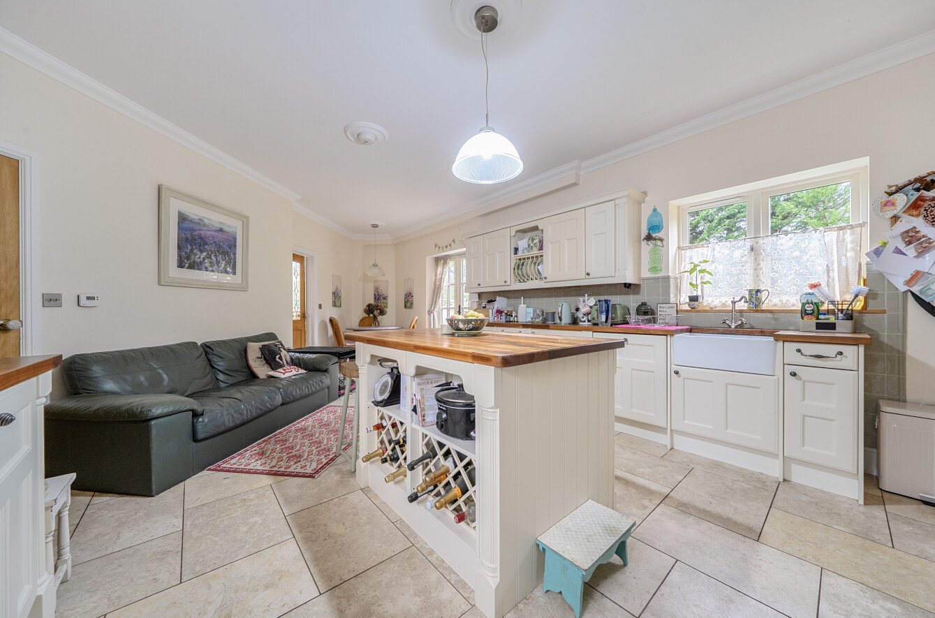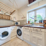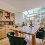 The showpiece of the home is the impressive open-plan kitchen, living and dining area — a wonderful social space featuring shaker-style cabinetry, solid wood worktops, and a feature range cooker. It’s the perfect setting for relaxed family life or hosting friends in style.