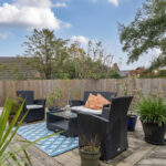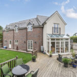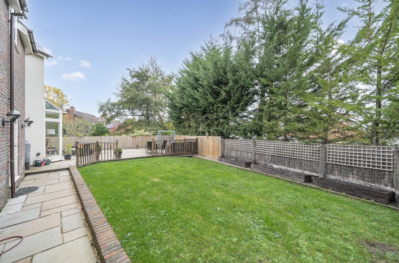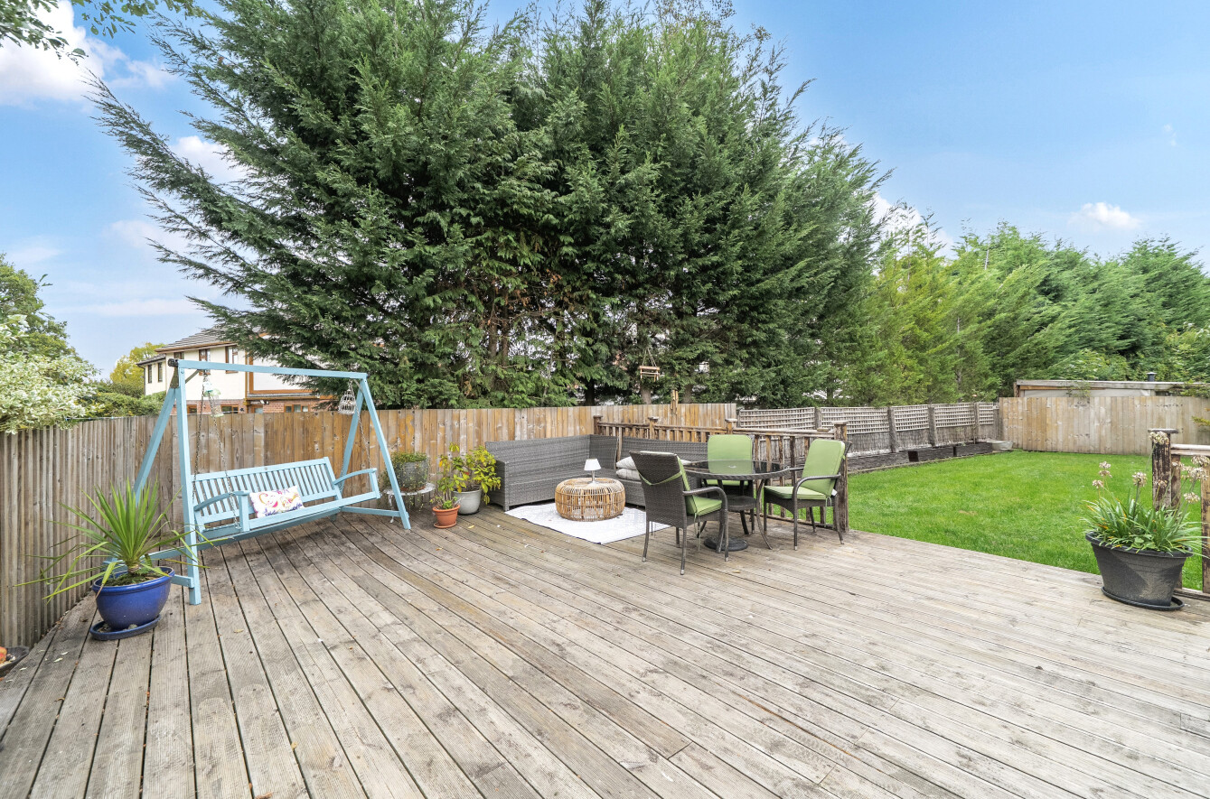 Outside, the home enjoys a private and mature garden that wraps around the property, offering a superb balance of open lawn and seating areas. The large decked terrace is ideal for outdoor dining and entertaining, catching the sun throughout the day. A spacious driveway provides ample parking for several vehicles.