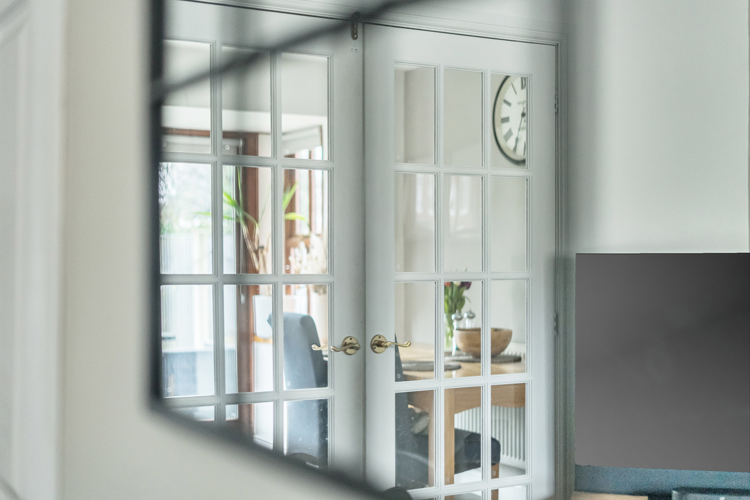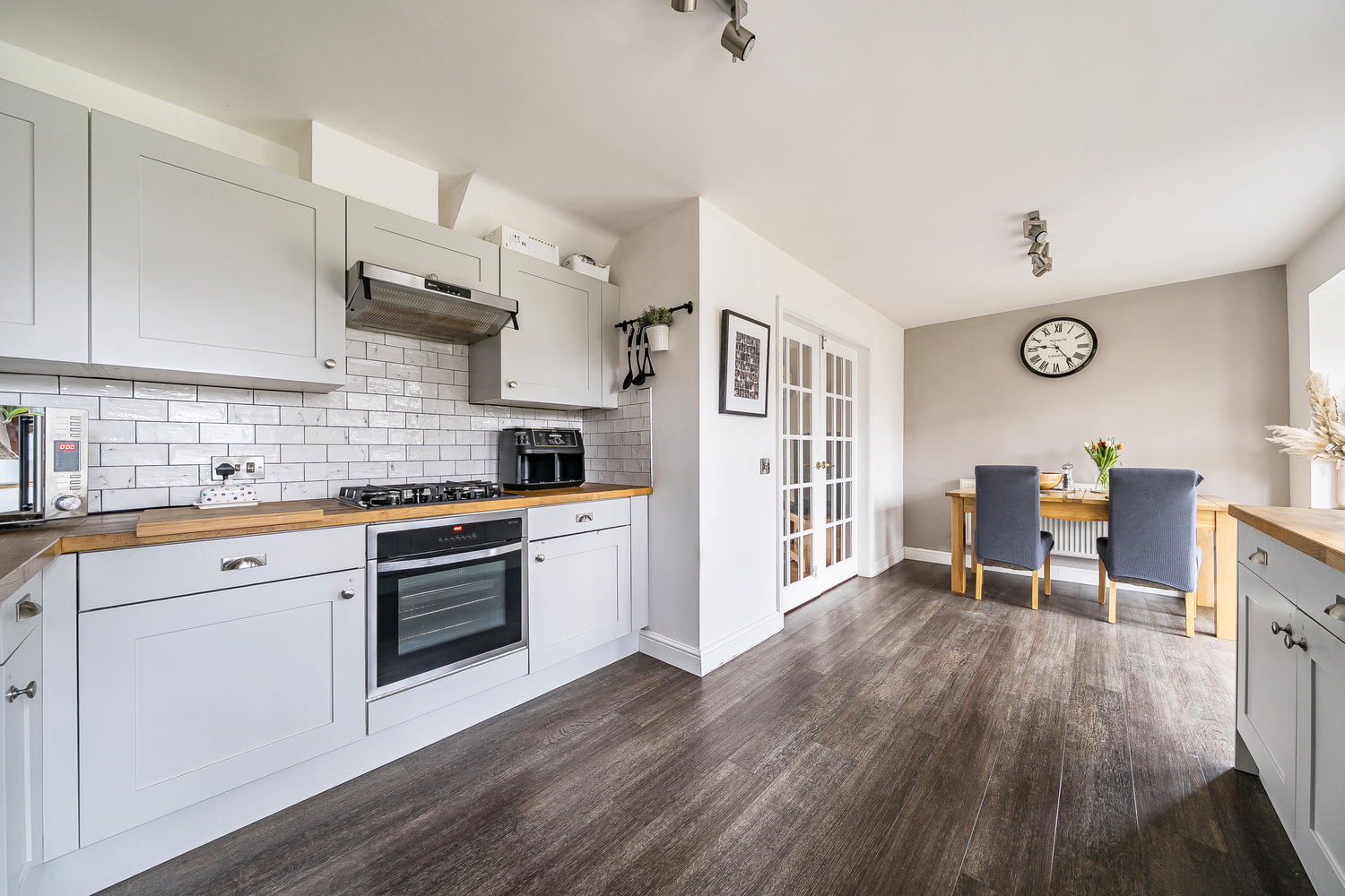 The principal living room is an elegant and well-proportioned space, finished with warm wood flooring and neutral décor. Double glazed French doors open seamlessly into the kitchen/dining area, creating flexibility for both open-plan living and cosy separation when desired. This is a superb space for entertaining or relaxed family evenings.