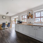 The kitchen is a true heart-of-the-home space — generously sized and beautifully appointed with shaker-style cabinetry, wood worktops and contemporary tiled splashbacks. Dual windows provide excellent natural light, while the layout offers extensive preparation space and storage.