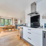 The contemporary open plan kitchen is fitted with integrated appliances and finished to a high specification, offering both style and functionality. The connection between the kitchen and living space ensures the home works equally well for day-to-day living and larger gatherings.