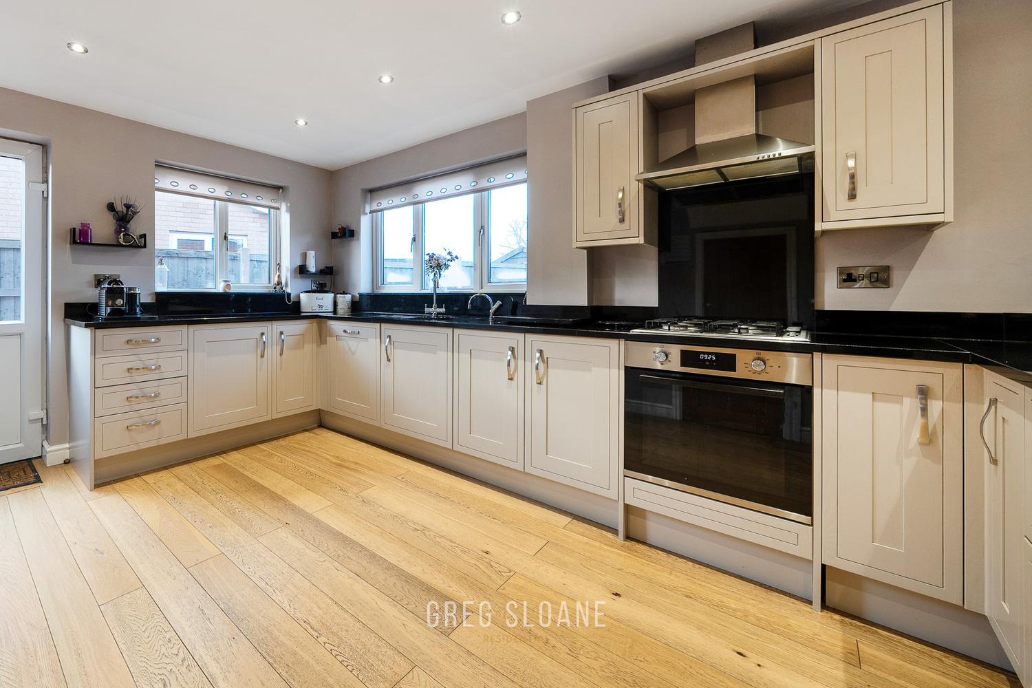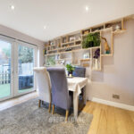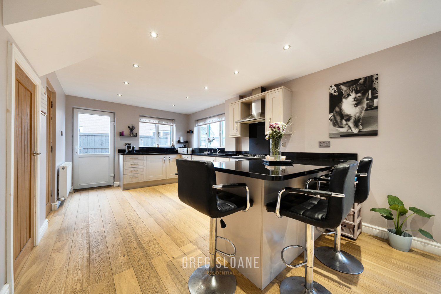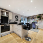 To the rear is the heart of the home – a stylish kitchen / diner, with patio doors opening out to the garden and creating a brilliant connection between indoor and outdoor living. The kitchen itself features sleek modern units, quartz worktops, and integrated appliances, while the warm-toned real wooden flooring adds a lovely natural feel and instantly makes the space feel welcoming. It’s a brilliant room for everyday life, entertaining friends, or channelling your inner MasterChef while still being part of the conversation.
