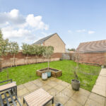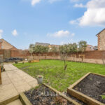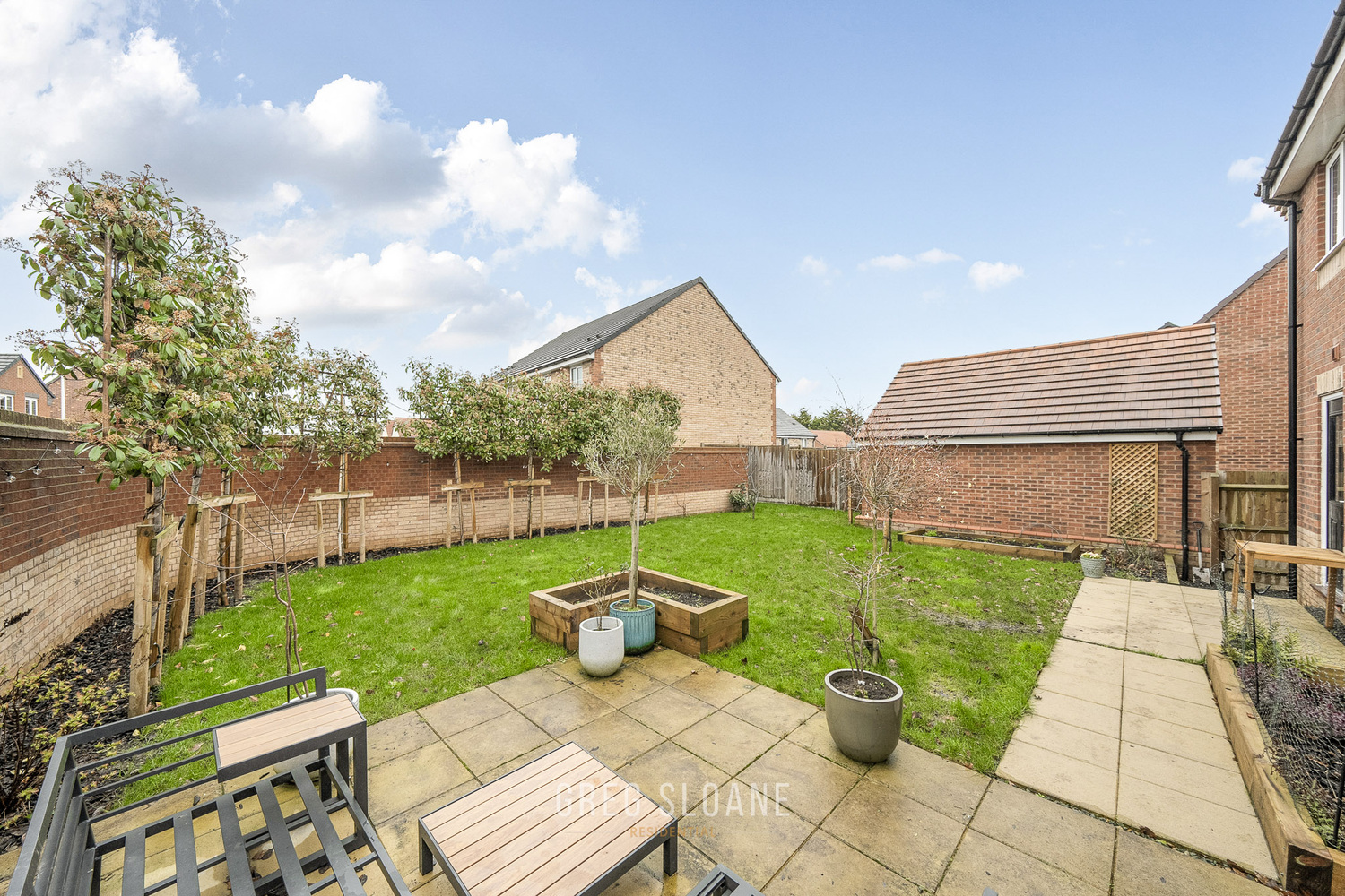 The outside space has been carefully arranged to be both attractive and easy to maintain. A large patio area provides the perfect spot for outdoor dining, while raised planters offer the opportunity for growing your own. Pleached trees along the boundary create a lovely sense of privacy while adding structure and greenery to the garden.