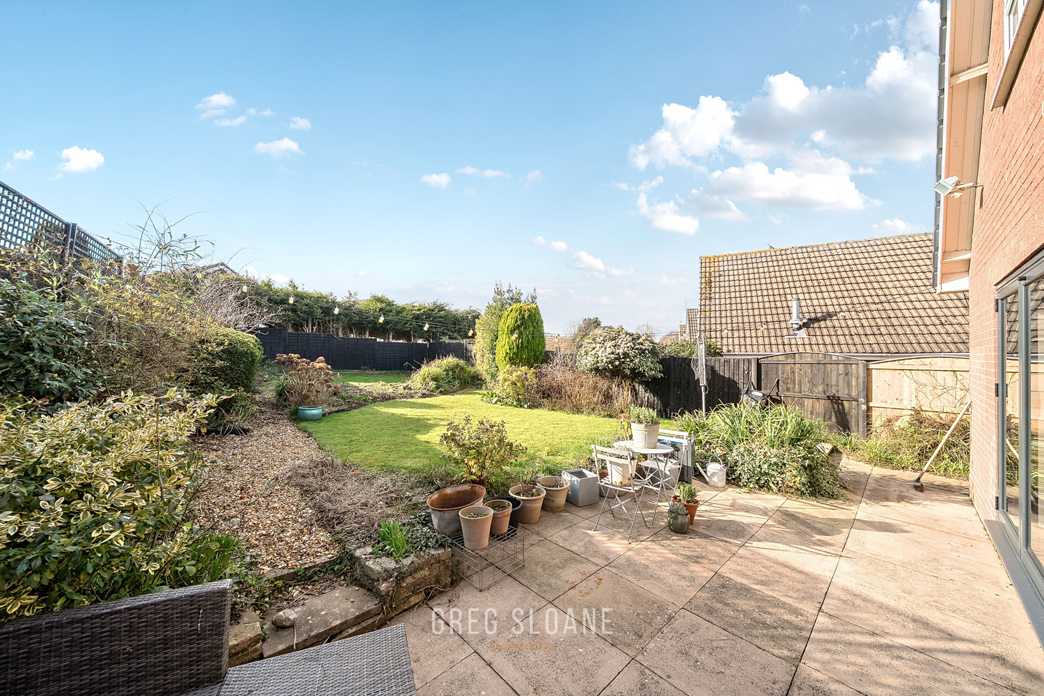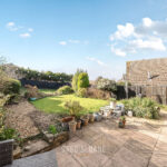The garden deserves a special mention. South-westerly facing, it enjoys sun well into the evening. A patio area provides the ideal spot for outdoor dining, while the lawn is interspersed with established shrubs and specimen trees, creating a private, leafy backdrop.
