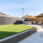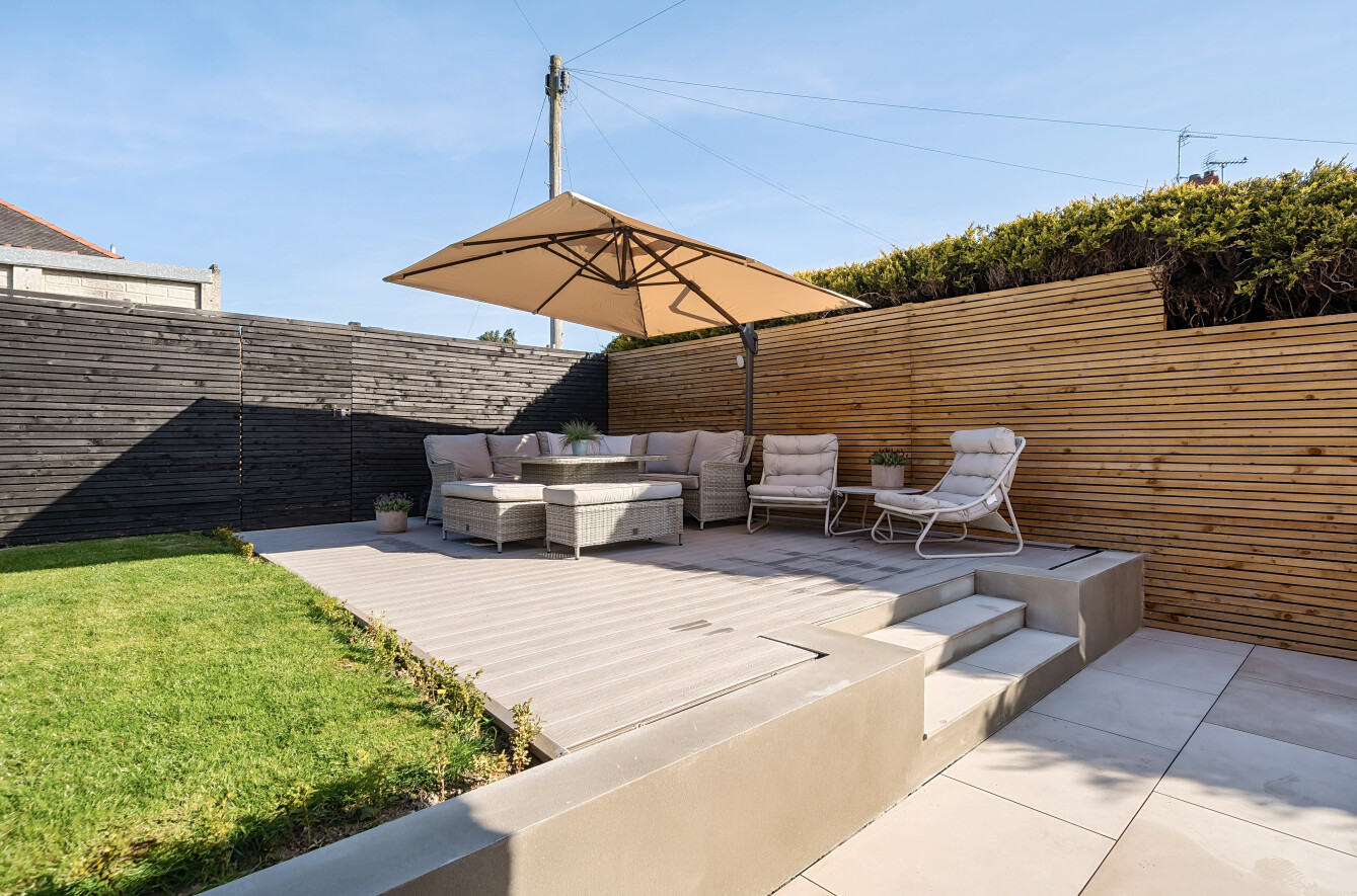 Outside: The garden has been expertly designed with high-quality, low-maintenance landscaping. It features a stylish composite decked area for seating and outdoor dining, complemented by a spacious porcelain-paved section with additional seating—perfect for both entertaining and relaxation. An integrated outdoor kitchen adds further appeal, ideal for al fresco dining and social occasions. Private side access enhances the home's sense of seclusion, while a garage and private parking space at the rear add everyday convenience. Positioned on a corner plot, the property enjoys an immediate sense of space and openness.