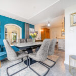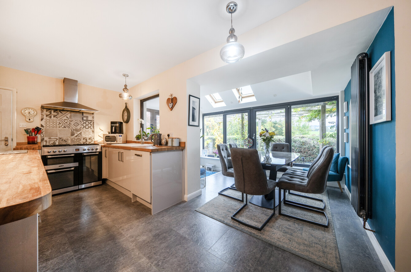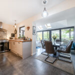 Dining Room, light filled with French doors to the rear garden, two Velux windows, and tiled effect flooring.