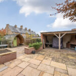 Decked and Indian stone patio areas with pergola overlooking open farmland.