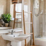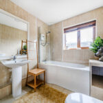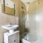 Family Bathroom, P-shaped bath with electric shower, fully tiled walls, and a heated towel rail.