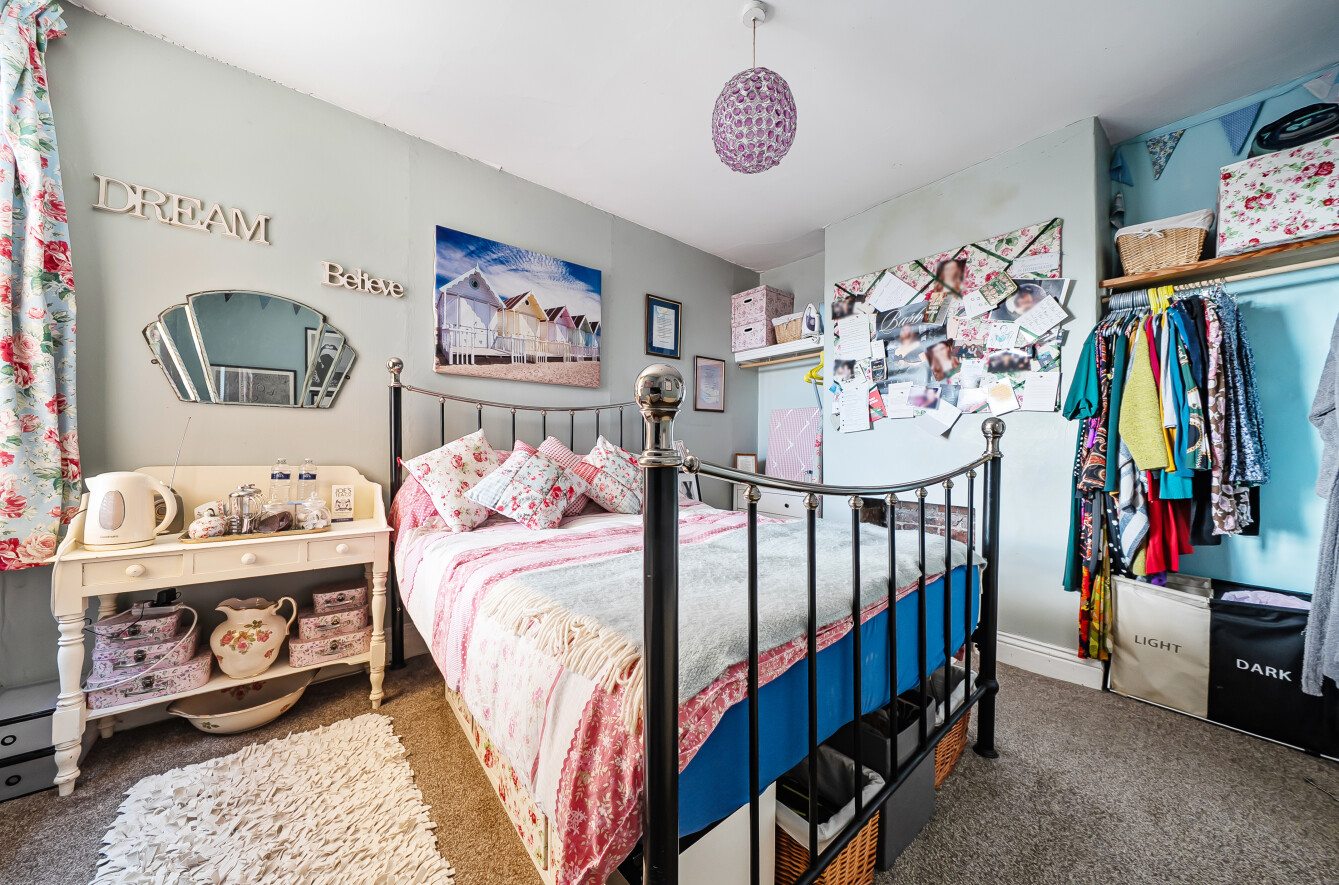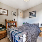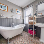 Upstairs, the first-floor landing leads to three well-proportioned bedrooms, two of which retain attractive period detailing. The beautifully appointed bathroom features a statement roll-top slipper bath with claw feet and a corner shower, complemented by decorative panelling and elegant period styling.