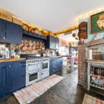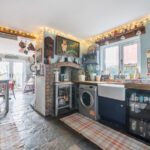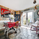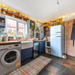 The welcoming reception hall leads into a stylish lounge centred around a traditional open fireplace — the perfect focal point for cosy evenings. The kitchen/breakfast room flows seamlessly into the dining room, which features a charming log-burning stove and French doors opening onto the enclosed garden, creating an excellent space for entertaining or relaxed family living. The kitchen is fitted with wooden units and worktops and enjoys excellent natural light.