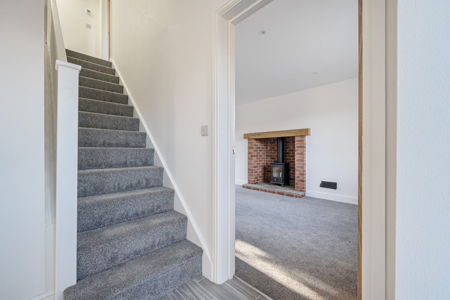 Comfort is assured throughout the year with underfloor heating to the ground floor and both upstairs bathrooms, powered by an air source heat pump for improved energy performance and lower ongoing costs. Upstairs offers three well-proportioned bedrooms, a contemporary family bathroom with bath and walk-in shower, and a light-filled principal suite with en-suite and Velux window.