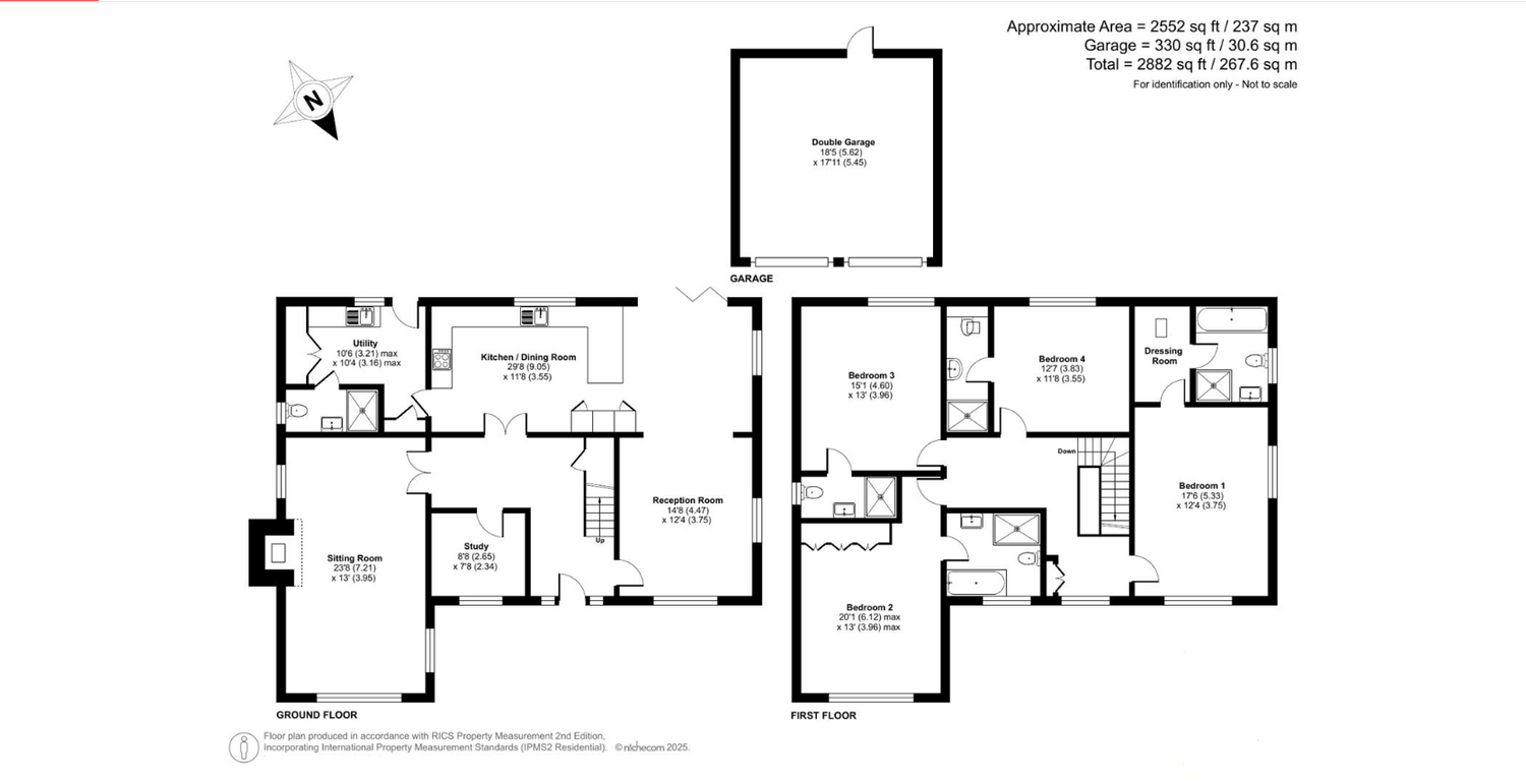To the first floor, there are four generously proportioned double bedrooms, each benefiting from its own private en-suite, offering exceptional comfort and privacy for family members and guests alike. The principal suite features a dressing room leading through to a luxurious en-suite bath and shower room. Bedroom two also enjoys both bath and shower facilities along with built-in wardrobes, while the remaining bedrooms are equally well-appointed.