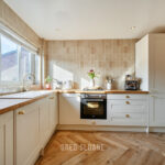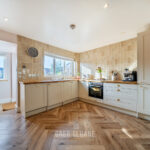 The warm-toned luxury vinyl flooring flows beautifully through the living space and into the kitchen. The kitchen itself is both stylish and practical, offering plenty of storage along with integrated appliances, timber-framed cabinetry and solid oak worktops.