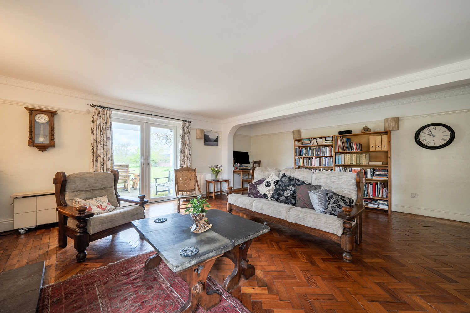 The sense of space here is exceptional. The principal reception areas are expansive and beautifully proportioned, allowing for multiple living zones within a single space while still feeling coherent and welcoming. French doors open out to the garden, reinforcing that connection between inside and out and enhancing the overall lifestyle offering.
