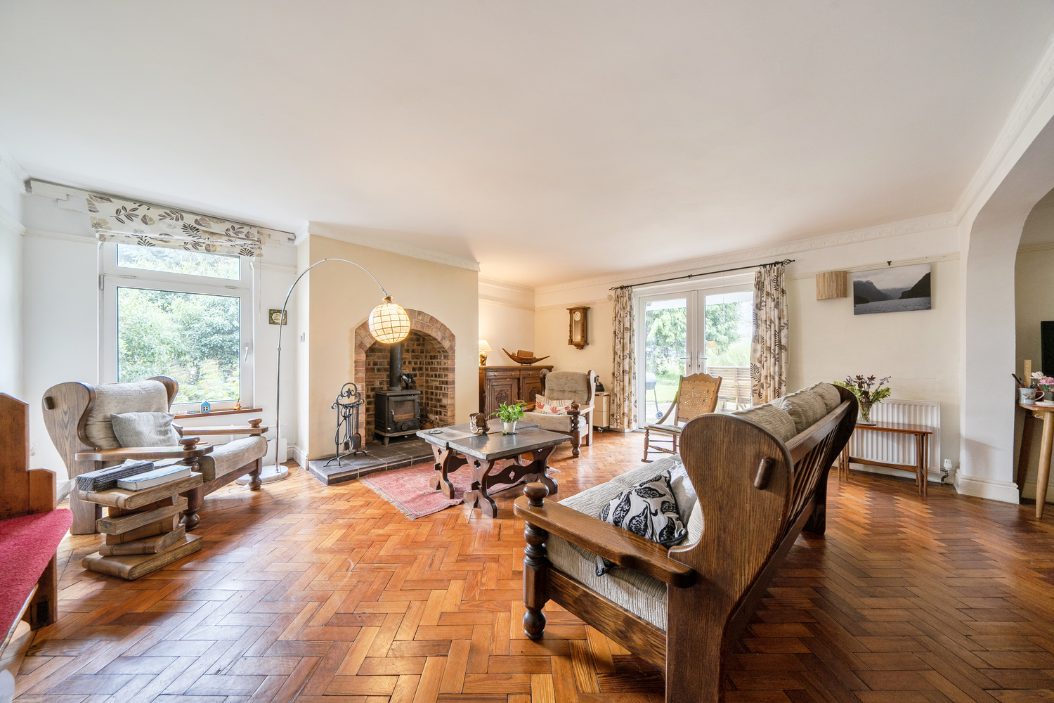 Character features such as parquet flooring, a feature fireplace with stove, and traditional detailing add warmth and depth, ensuring the property feels established rather than overly modernised.